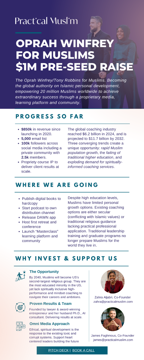 Practical Muslim is positioned to become the Oprah Winfrey for Muslims: a trusted media and coaching platform that combines Islamic wisdom with transformational personal development to empower ambitious Muslims worldwide.Â